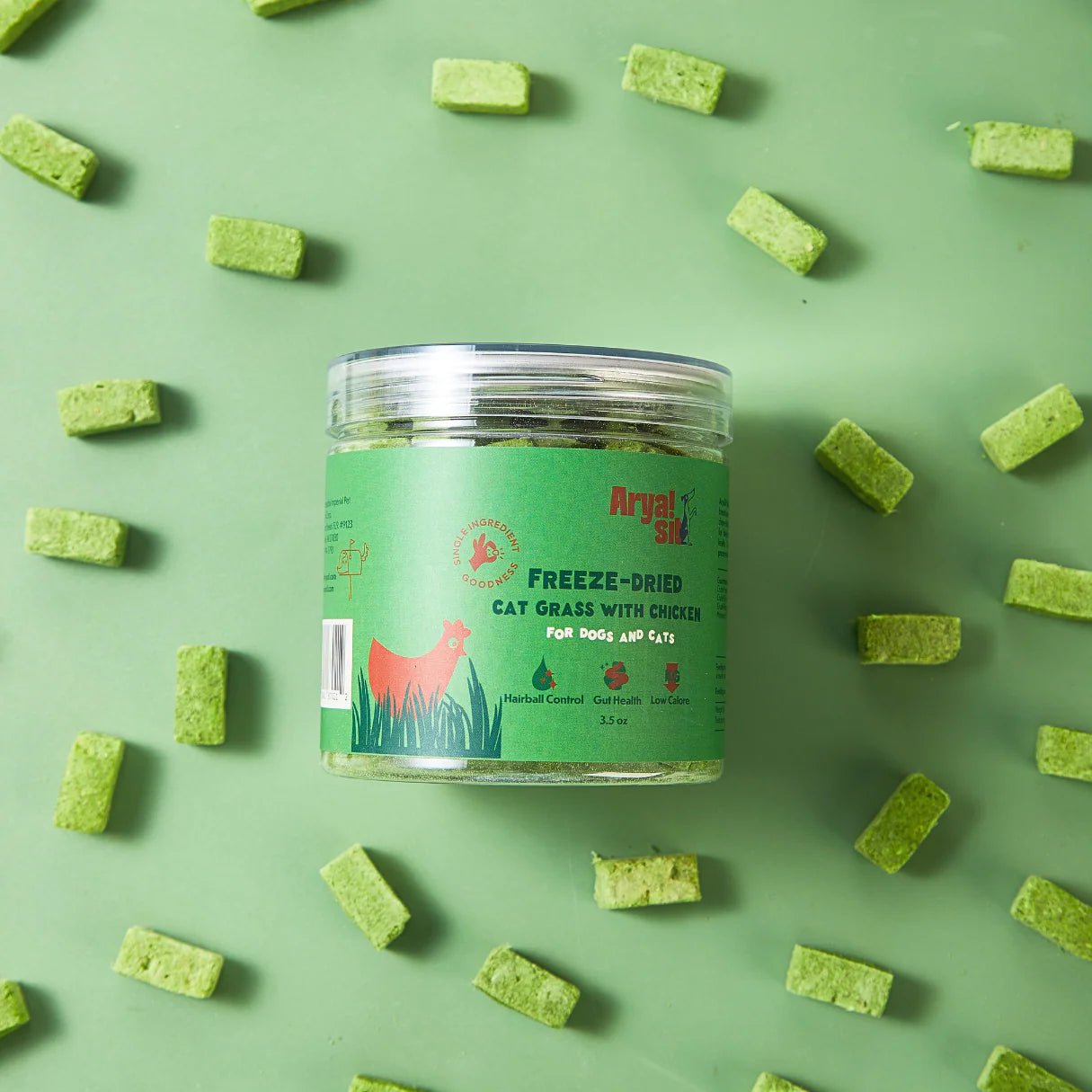 AryaSit! delicious freeze-dried cat grass with chicken bites are made for your cats! A premium bite-sized chews that deliver the best taste and natural solution for hairball issues, while also supporting digestive health. Contains no artificial flavors, sweeteners or preservatives.